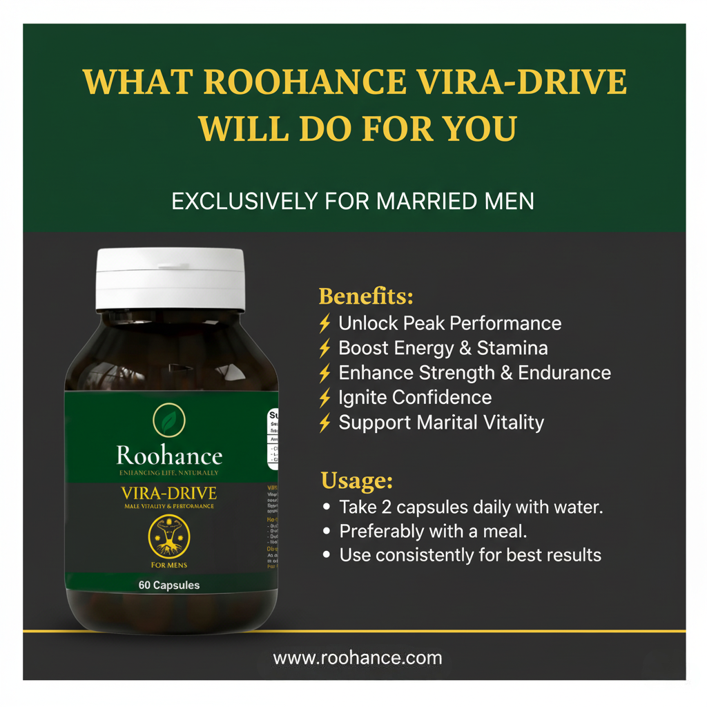 Are you a married man looking to reignite your inner fire, boost your stamina, and enhance overall vitality? Introducing Vira-Drive by Roohance, a premium, high-potency formula specifically designed to support the unique needs of men in long-term relationships. Rooted in Ayurvedic wisdom, Vira-Drive goes beyond temporary fixes, nourishing your body from within to help you achieve peak performance in every aspect of life.